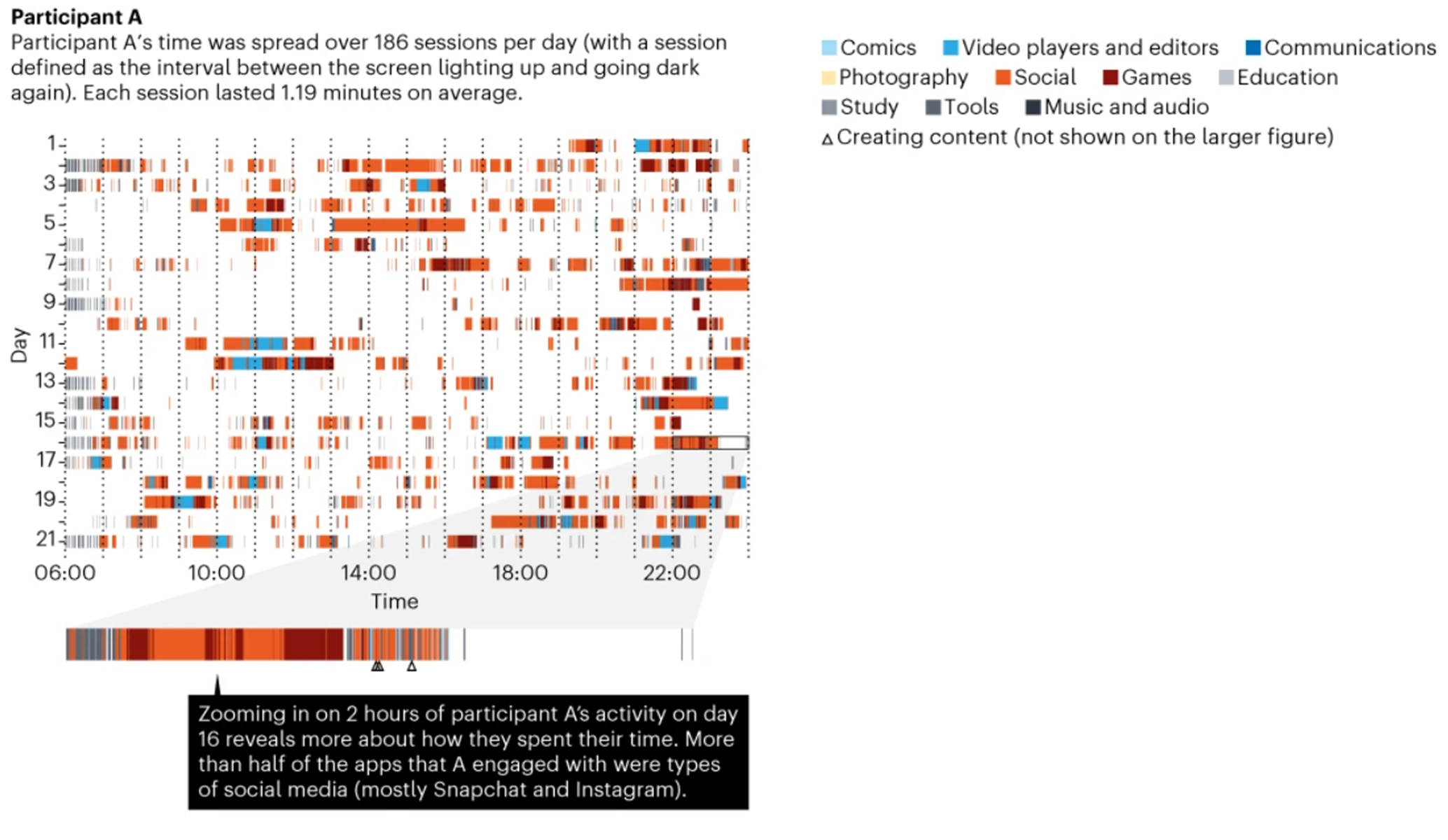 The screenomes serve an ambitious purpose to “record and analyse everything people see and do on their screens” (Reeves et al., 2020), yet it lacks an actual specification for what the screenomes are meant to prove. The screenomes set out to be a measurement of smartphone use without solely relying on measuring the participants’ screen time and app use. Yet the only available findings are overviews of screenshots (see Figure 1) and descriptives such as the median use of the smartphone per day, moments during the day where phones are used, and engagement with different apps (e.g., of all the apps participant A engaged in, 53.2% were social media apps; Reeves et al., 2020). If you zoom in on an individual level, the overview of screenshots also boils down to a combination of screen time and app use (see Figure 1). Screenomes on their own therefore seem to tell very little. Or rather, it provides little extra information on top of what measures of screen time and app usage could not already provide.