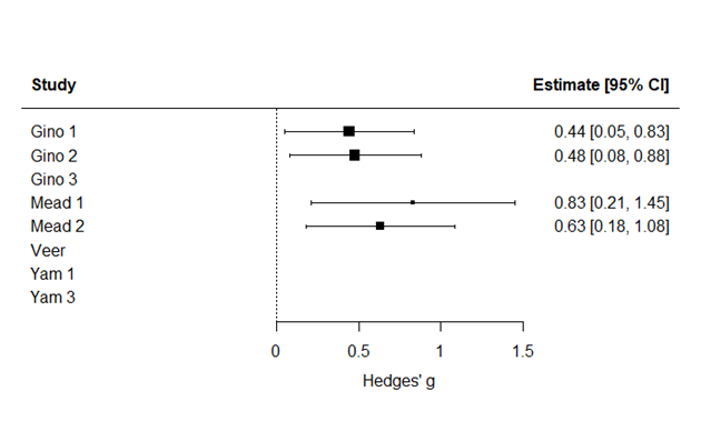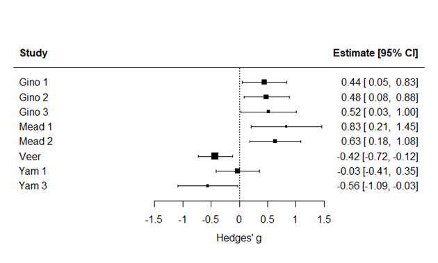 Statcheck ended up finding three statistical inconsistencies: one in Van ‘t Veer et al. (2014) and two in Yam et al. (2014), where one inconsistency was related to Study 1 and the other consistency to Study 3. GRIM found an inconsistency in the third study of Gino et al. (2011). By removing these four primary studies, the meta-analytic effect size went from 0.22 to 0.55. This big increase stems from the fact that three of the four omitted studies had a negative effect, leaving only positive effects to drive the new meta-analytic estimate. In Figure 1 and Figure 2 you can find the forest plots with and without the primary studies, respectively. The data and code for this small pilot study can be found in this OSF repository.